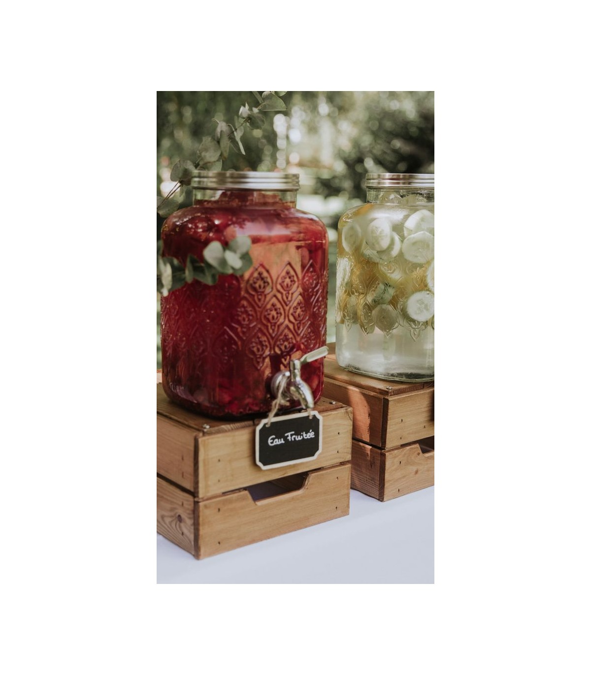 Infusion détox maison au miel et fruits bio dans une jolie fontaine en verre avec gobelets krafts et pailles en cartons.