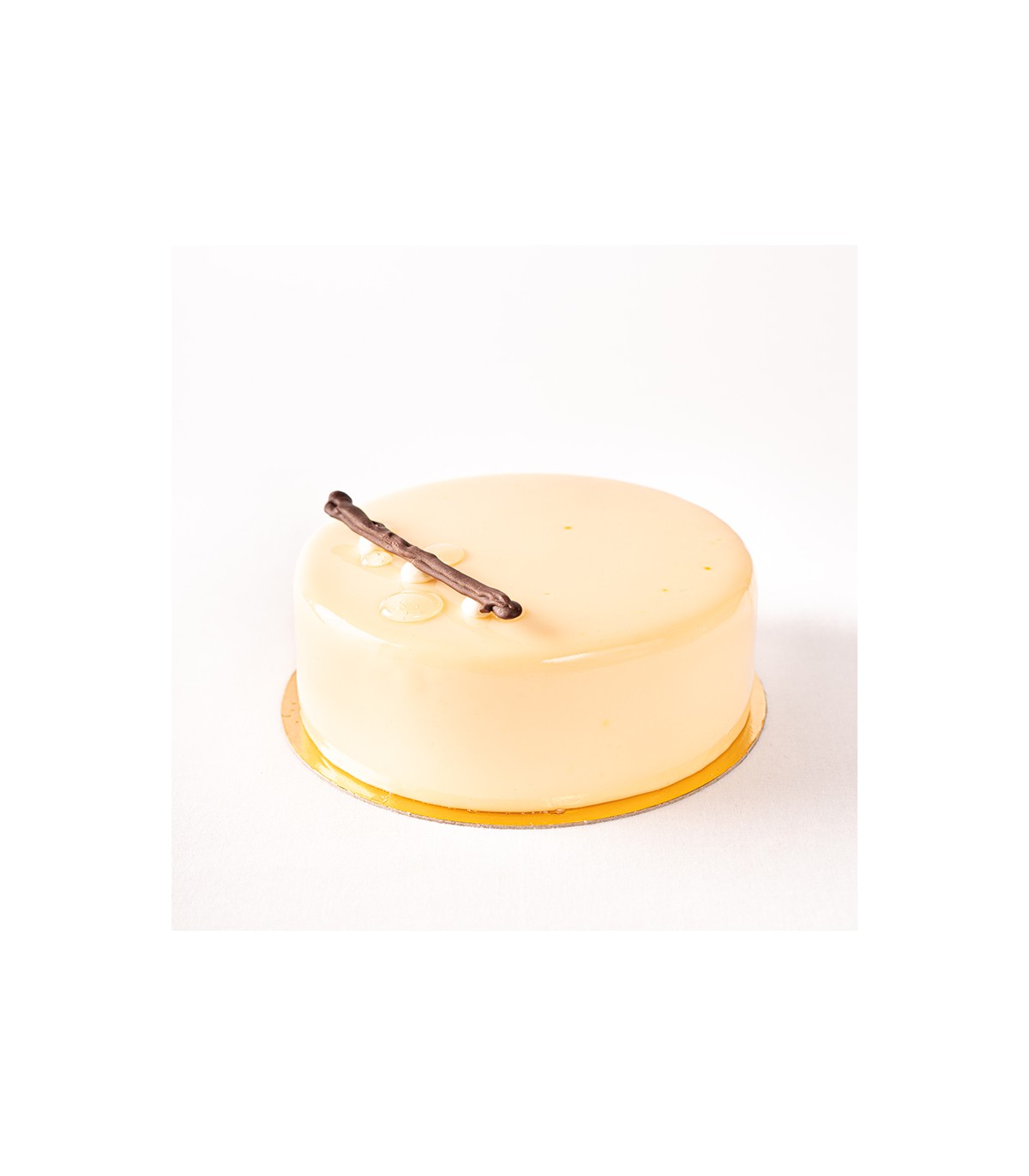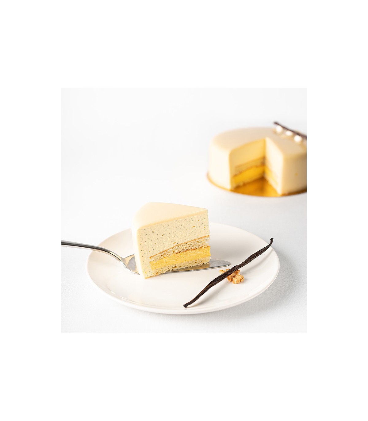Un flocage comme du velours, un entremet savoureux tout en légèreté ! Biscuit moelleux, crémeux fraise, mousse chocolat blanc à la vanille de Madagascar, flocage chocolat blanc. Réalisé par notre partenaire Haart...