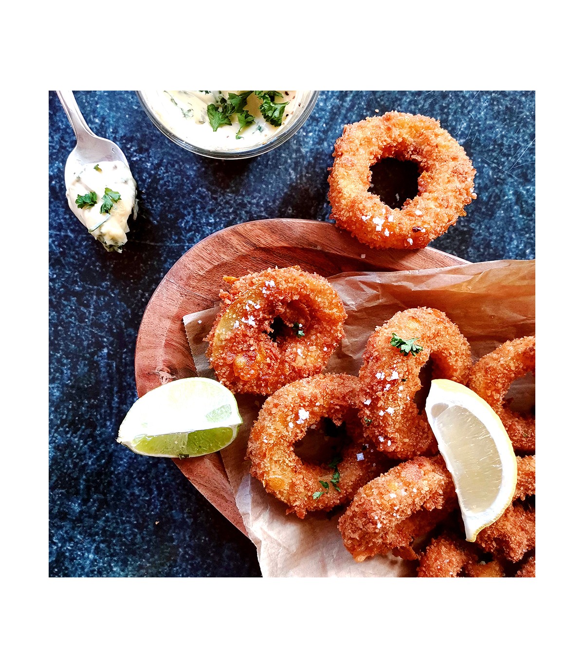 L'inimitable calamar à la Romaine. Servis avec une sauce tartare maison et des quartiers de citrons !