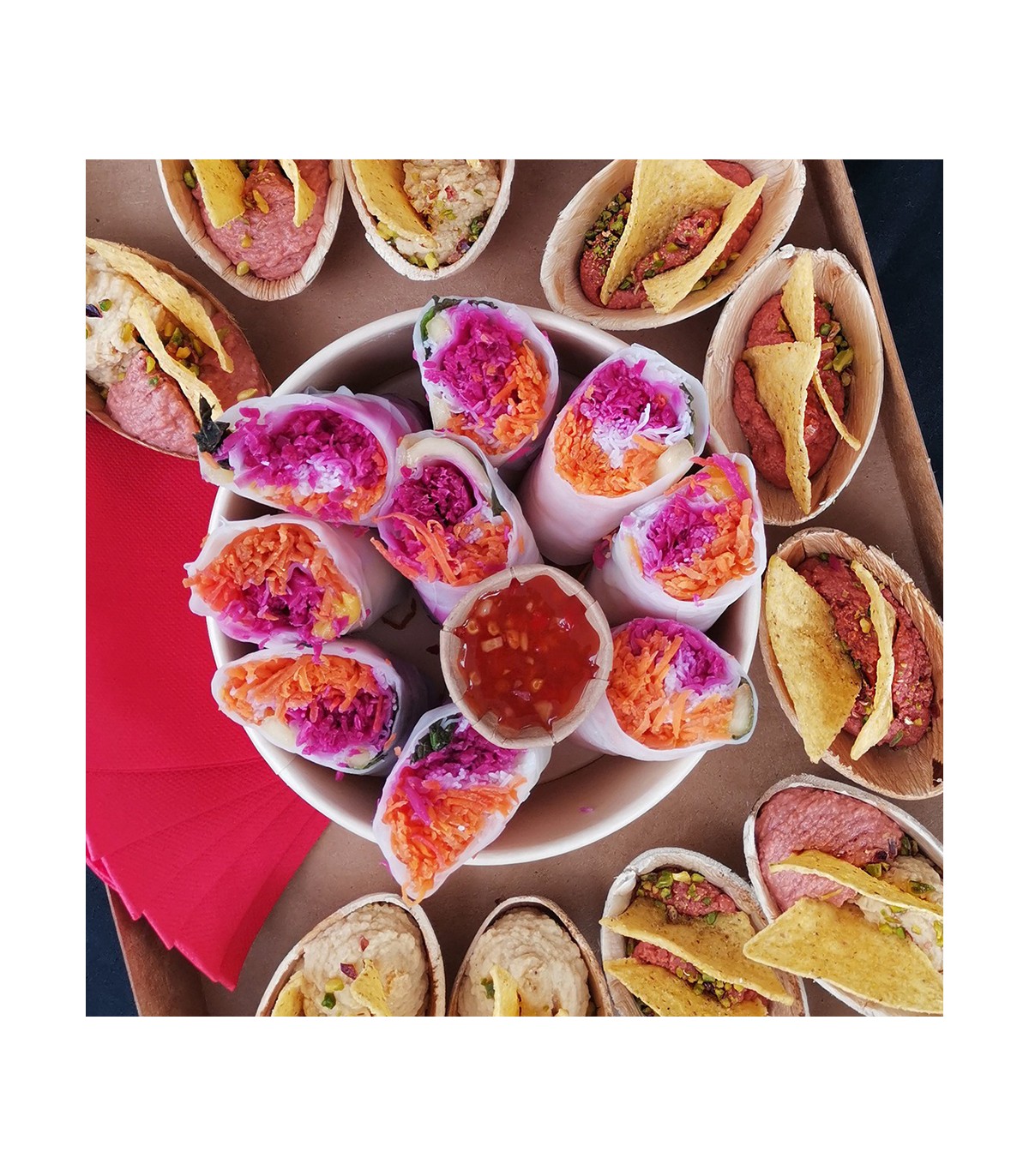 Chou rouge, mangue, carotte, soja, menthe, enroulé dans une feuille de riz, se déguste frais avec une sauce aigre douce !